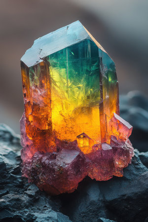 This stunning image captures a vibrant tourmaline crystal featuring striking shades of pink, yellow, and white. The intricate formations and textures highlight the natural beauty found in geological specimens. Perfect for art, education, or decoration.