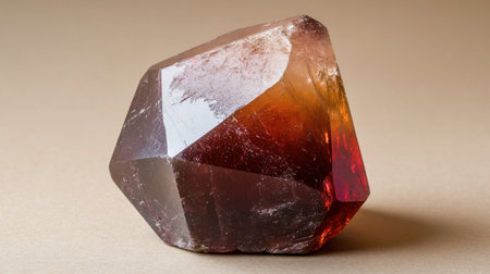 A close-up of a polished garnet gemstone, deep red with fiery undertones, displayed against a neutral background.