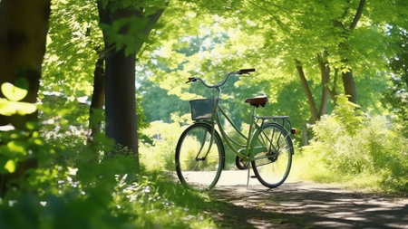 Generative AI : Bicycle in shade of trees with dense foliage in sundrenched urban natural spring summer park