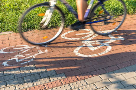 Blurred cyclist riding bicycle on a bike path in Wroclaw Poland.