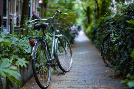 A bicycle parked in a lush urban area, symbolizing eco-friendly transport and wellness.