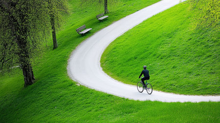 A cyclist enjoys a tranquil ride along a winding path in a vibrant green park, surrounded by trees and benches, creating a serene outdoor experience ideal for relaxation and exercise.