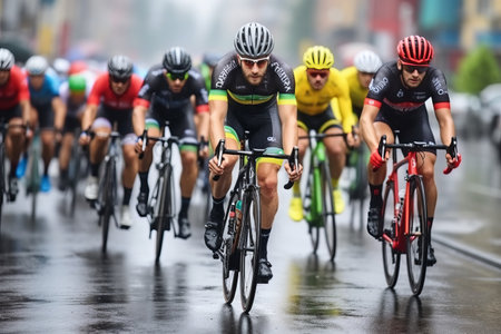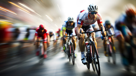 A group of cyclists are racing down a road. Concept of competition and excitement as the riders pedal their bikes