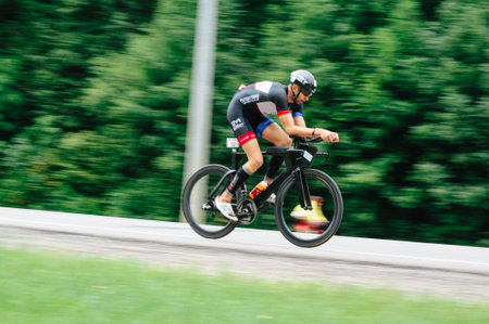 KHARKIV, UKRAINE - August 2, 2020: Triathon biking cyclist triathlete riding racing bike during ironman competition. Road cycling athlete in tri suit and helmet. Public events are allowed. Europe sport during CV pandemic.