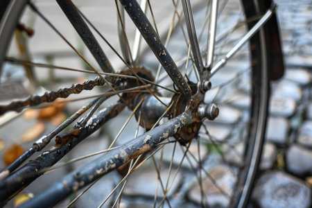 Close up of a rusty bicycle chain and gear mechanism on a vintage bicycle