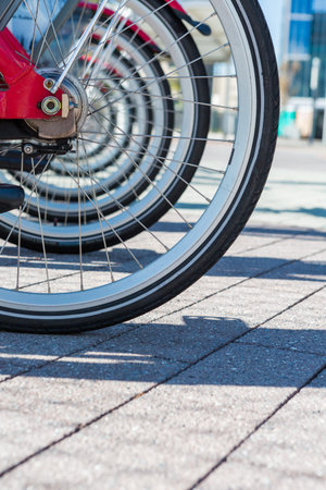 wheels of bicycle for rent standing on the parking