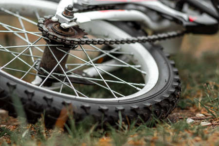 Wheel with a tread with a chain closeup. Bike, cardio workout