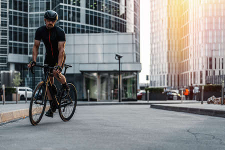 Sportsman riding professional bike next to modern buildings and skyscrapers.