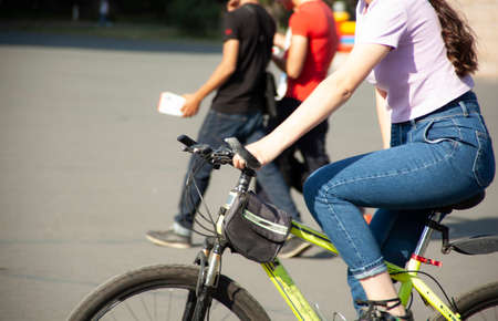 Seville Spain September 18, 2021 People rolling with a bicycle in the streets of Seville, an emblematic city and the capital of the region of Andalusia, in the south of Spain