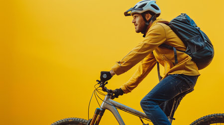 A man wearing a helmet rides a mountain bike against a bright yellow background.