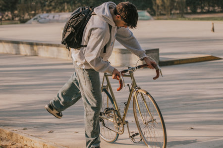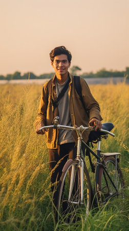 Just me and my bike Handsome young man standing near his bicycle and smiling while being outdoors : Generative AI