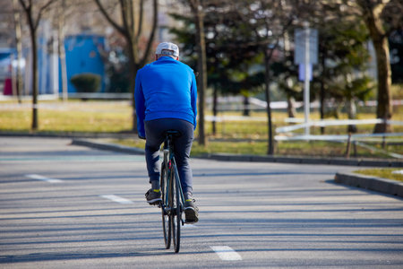 Leisurely bike ride by an older man in a park, dressed in black with a beanie, amidst green scenery. AI generative.
