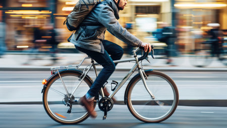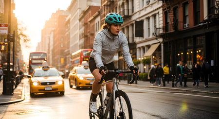A person cycles on city streets in the morning while commuting to work. Cars and buildings are seen in the background.
