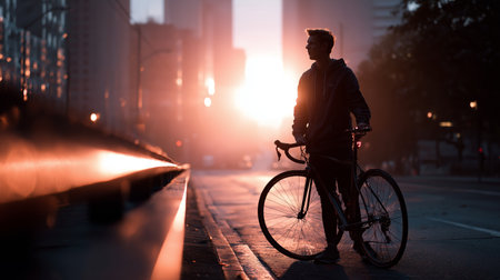 Sunset cyclist enjoying urban scenery in a quiet city street