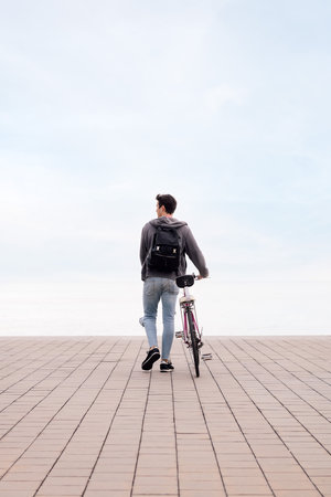 rear view of a young man walking while pushing a bike, concept of ecological and sustainable transportation, copy space for text, vertical photo
