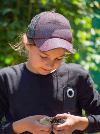 Portrait of a little girl holding chickens in her hands. Happy girl with little chicks in the fresh air. Portrait of a charming girl, a happy child holding fluffy chickens with both hands and smiling.