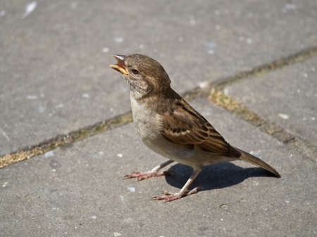 Singing female House Sparrow on the pavement in the city. Passer domesticus. Bird on the concrete sidewalk..