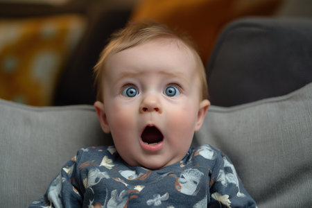 A child in a blue shirt looks up with his mouth open. Emotion of surprise on the baby's face