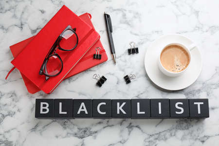 Black wooden cubes with word Blacklist, cup of coffee and office stationery on white marble table, flat lay