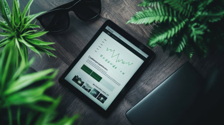 A stylish digital workspace featuring a tablet with graph data, surrounded by green plants, sunglasses, and a smartphone, creating an inspiring and modern atmosphere.