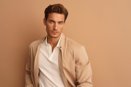 Portrait of a handsome young man in beige suit. Men's beauty, fashion, Caucasian handsome man isolated on a beige background, AI Generated