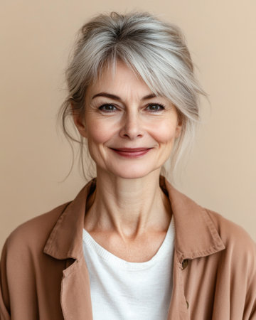 Middle aged woman smiling isolated from a copyspace background. Inclusivity conceptual image