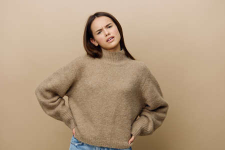 upset, sad, beautiful woman in a warm, textured sweater stands on a beige background with her hands on her belt and lowering the corners of her lips down looks at the camera