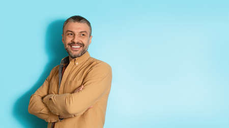 Cheerful Middle Aged Male Crossing Hands Standing Over Blue Background