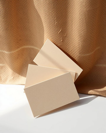 A close-up image featuring beige business cards stacked in front of a rough beige fabric, bathed in soft light. The cards' textures create a subtle yet compelling visual.