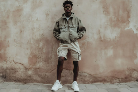 Fashionable man showcasing contemporary streetwear style against a weathered wall, highlighting urban youth culture and clothing trends