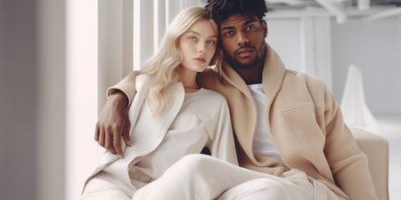 Fashion couple on beige background in studio. Couple of man with curly hair and blonde woman in hairdresser salon. Vogue Style. Youth, love and lifestyle concept.