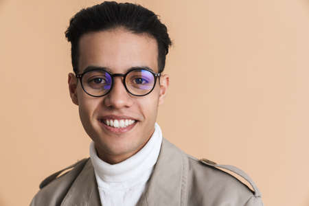 Young middle eastern man in eyeglasses smiling and looking at camera isolated over beige background