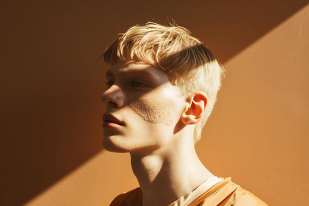 Portrait of a handsome young man with blond hair, wearing orange t-shirt