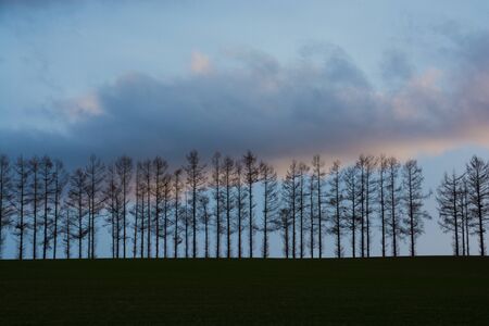 Spring sunset sky and larch trees in Biei