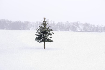 Pine tree standing in the snow field in Biei