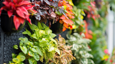 Explore a stunning display of lush greenery and vibrant colors in this vertical garden. Perfect for enhancing any indoor or outdoor space with natural beauty and life.