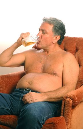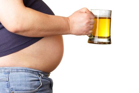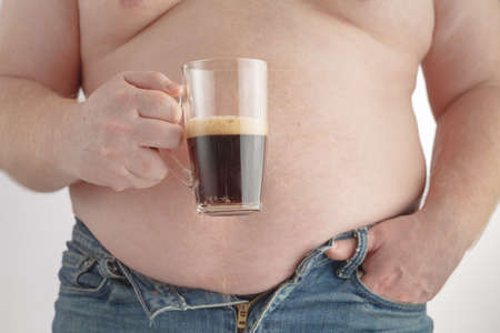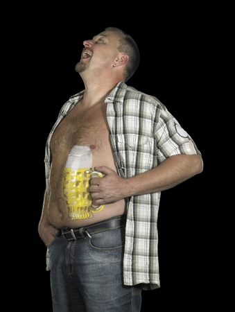 Man with big stomach with a glass of beer in his hand.