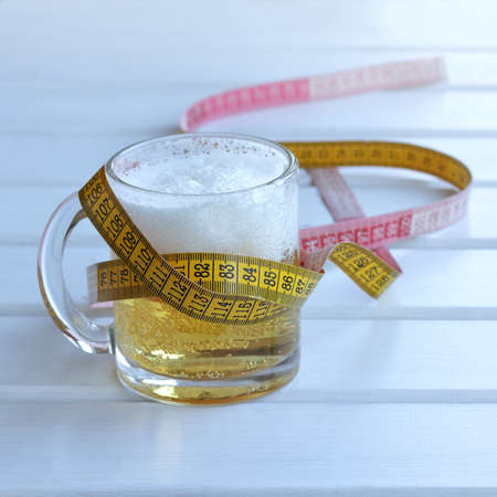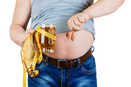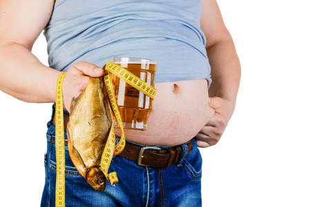 The belly of a fat man isolated on white background. Full man holding a measuring tape, a glass of beer and fish. Weight Loss.