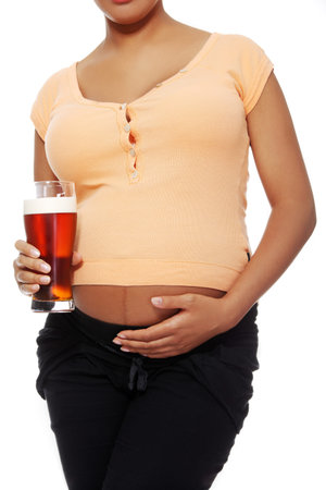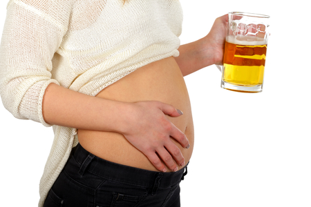 Front view of a pregnant woman holding a glass of alcohol next to her tummy, isolated on white backgroung.