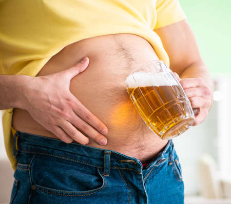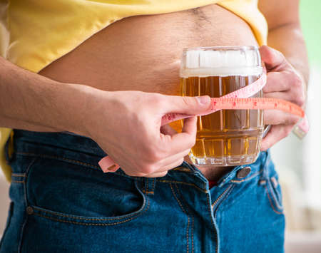 Fat obese man holding beer in dieting concept