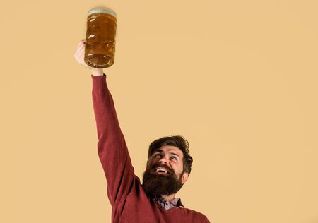 Alcohol. Oktoberfest. Germany traditions. Glass of beer. Celebration Oktoberfest. Happy bearded man with glass beer. Beer pub. Brewery concept. Man tasting draft beer
