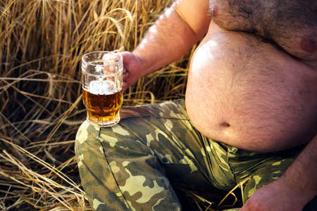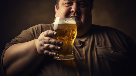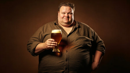 Obese man with big belly holding a glass of refreshing cold beer