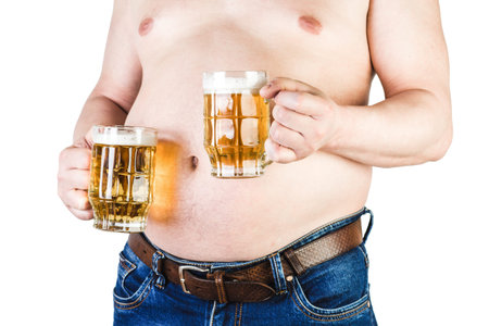 Man with big belly holding glass of beer on white background