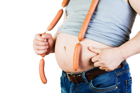 Belly fat man isolated on white background. The concept of healthy and proper nutrition.