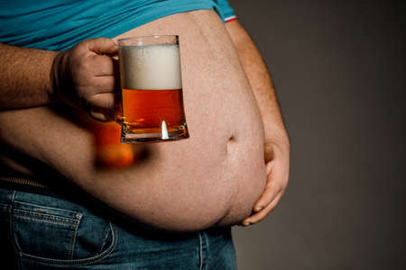 Overweight man with obese belly holding mug of beer, copy space.