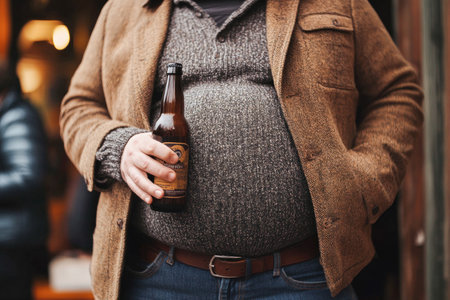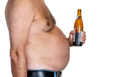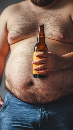 Overweight man holding a beer bottle, showing his big belly and suffering from obesity