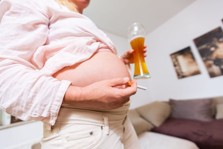 a pregnant woman with a beer and a cigarette in her hand