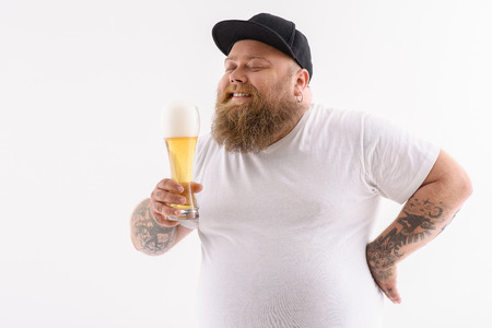 Joyful fat man is drinking beer and smiling. His eyes are closed with pleasure. Isolated and copy space in left side