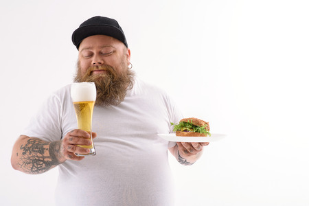 Happy male fatso is enjoying unhealthy beer and hamburger. He is standing and smiling. Isolated and copy space in eight side