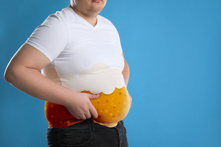 Beer belly problem. Overweight man on blue background, close up